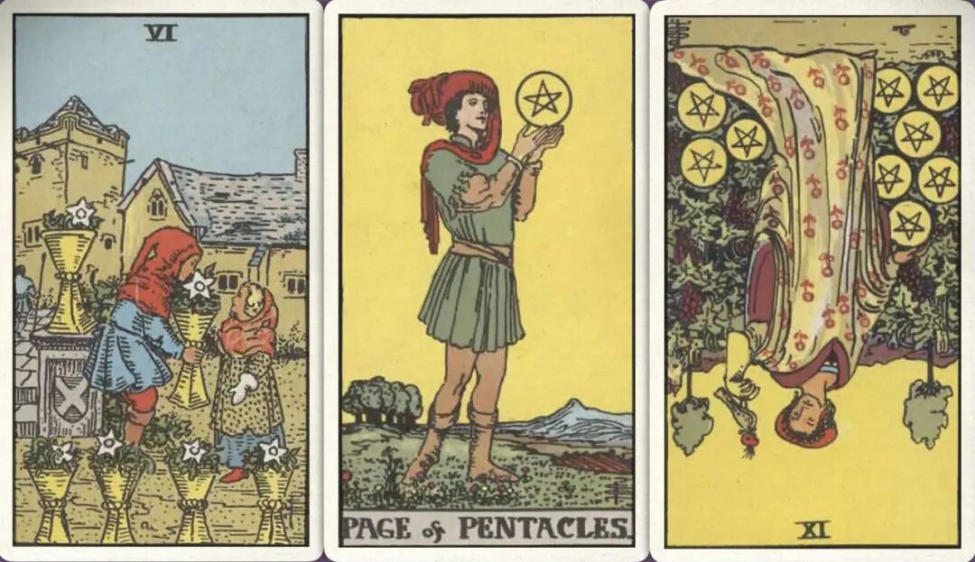 牌:圣杯六+ 星币侍从+ 星币九-