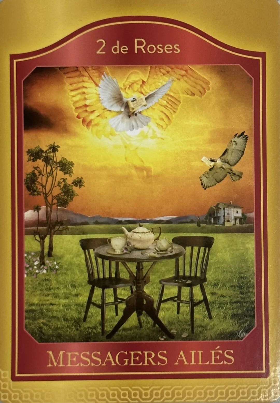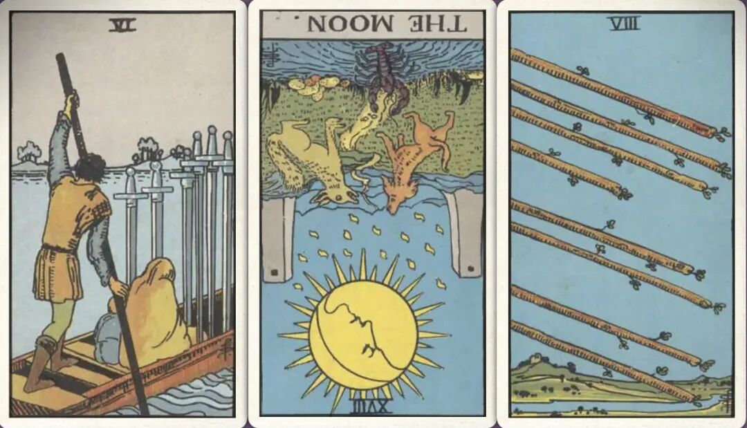 牌:宝剑六+ 月亮- 权杖八+