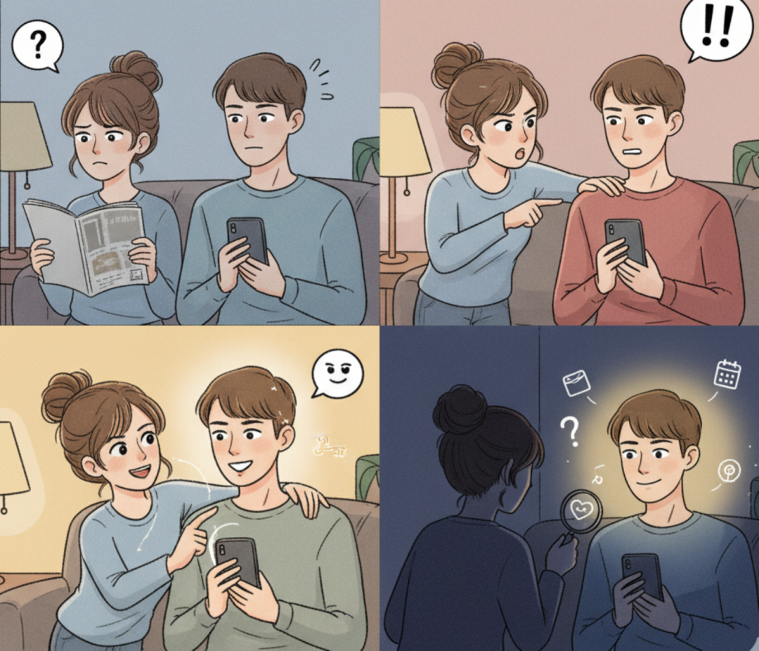 你的伴侣最近比平时更常对着手机露出微笑,但当你走近时,他会迅速锁屏或将手机翻面。你当下的直觉反应是?