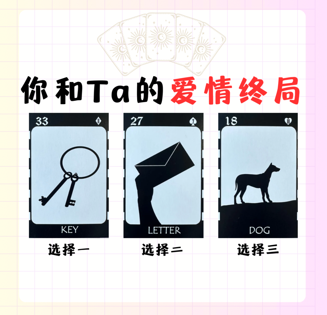规则:保持内心安静的状态,想着对方,从下面三组牌中选一组你比较有感觉的。选好后下翻查看答案。