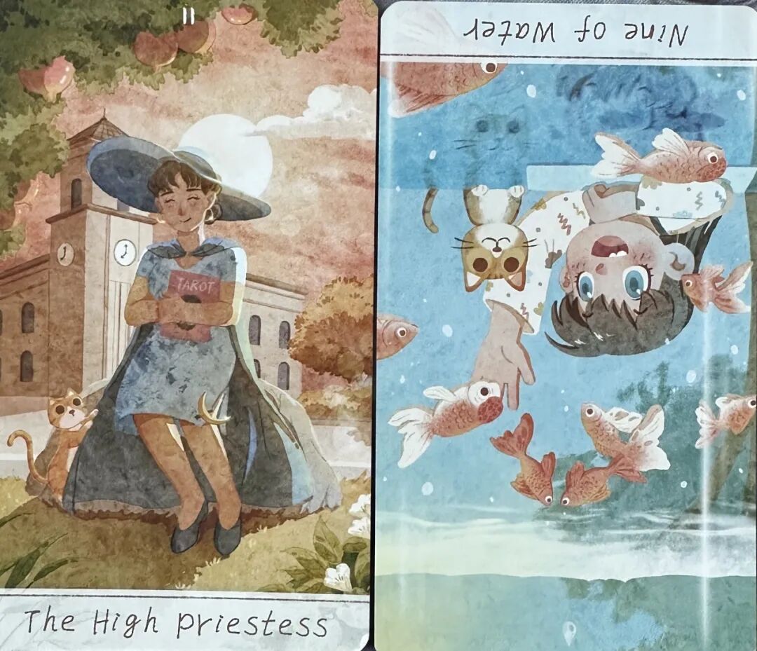 分析:女祭司的沉稳,配上圣杯九的感情,其实你们的关系如果好好走,还是能稳稳发展下去的。但毕竟圣杯九是逆位诶,说明你们双方都觉得对方并不是那么棒的选择。如果你们现在年龄都还小,那这段关系要有结果会比较难,可能一开始不太熟,感情不深的时候还好,一旦接触多了,容易觉得不满和相互嫌弃,导致很难长久。