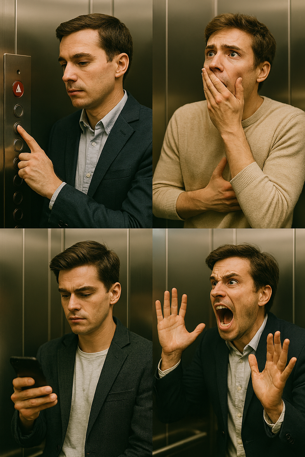 想像你正在搭乘电梯,电梯突然在半空中停住,你的反应是?