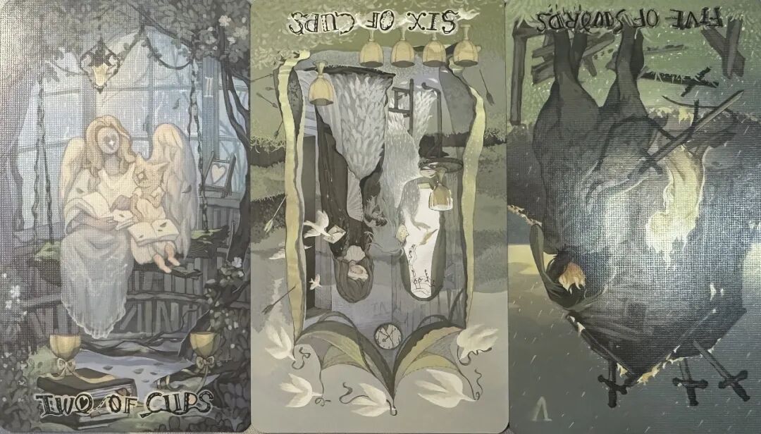 牌:圣杯二+ 圣杯六- 宝剑五-