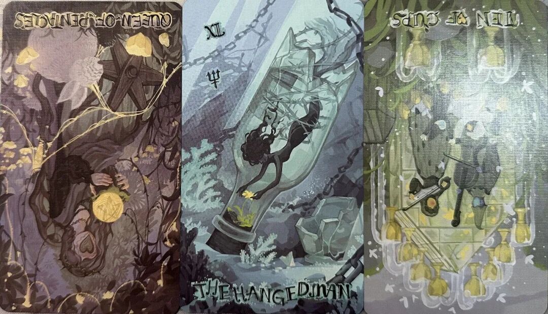 牌:星币皇后- 倒吊人+ 圣杯十-