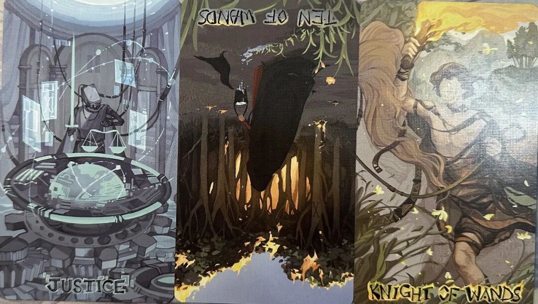 牌:正义+ 权杖十- 权杖骑士+