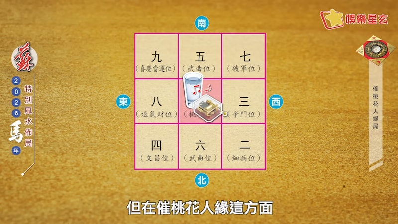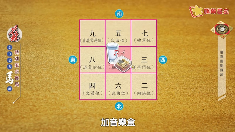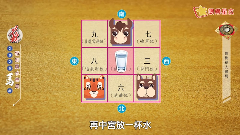 但如果纯粹只想旺人缘,师傅强烈建议不要加音乐盒,以免变成桃花「催得太劲」。另外,今年是马年,只要在东北摆虎、正南摆马、西北摆狗,再配合中宫放一杯水,不需要大换风水局,就能特别旺人缘和桃花。