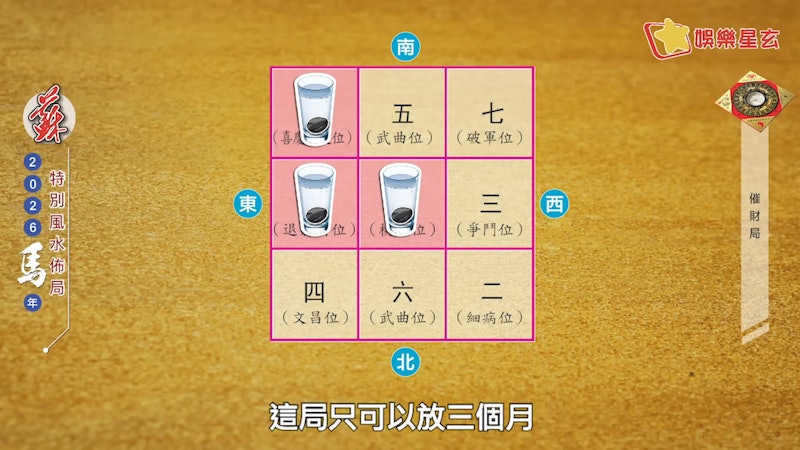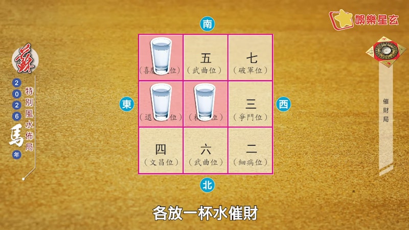 今年催财要特别留意,因为要食正「过去、现在、未来」的三个财位,分别是过去财位正东、现在财位东南,以及未来财位中宫。师傅建议在3月6日后,于这三个方位各放一杯水来平稳催财,简单全年摆放即可。