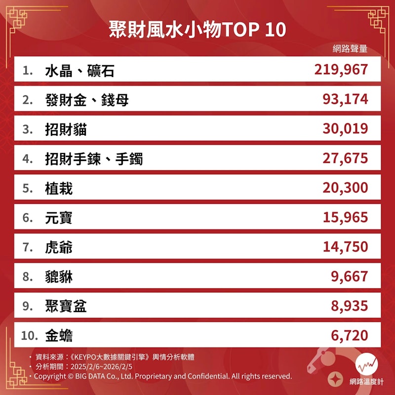 《网路温度计DailyView》透过舆情分析软体《KEYPO大数据关键引擎》,调查出网路讨论度最高的十大聚财风水小物,教你如何正确摆放搭配,让事业与生活同步开运,是新年必收藏的吉祥指南。