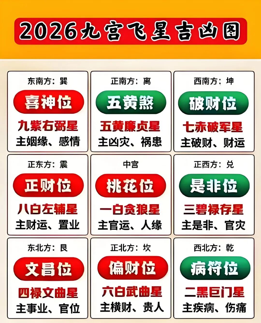 要注意的是,2026年的太岁方位在正南方,所谓太岁头上动土必有祸,所以今年正南方一带绝对不宜动土,正北方位则为岁破方,最好也别动土,尤其是家中有属马、鼠、牛、兔的人。代表凶灾的五黄位在正南方,代表疾病和伤害的二黑位在西北方,需要特别注意。如果一定要动土,犯太岁的人必须忍住手,自己别动。另:中宫是今年的流年桃花位,东北方是今年的流年文昌位,正东方是今年的流年财位,可以善用。