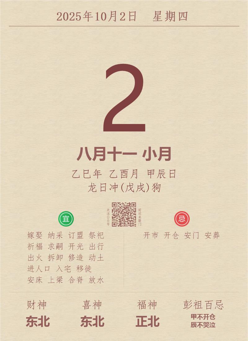 时宜:趋乾 求嗣 嫁娶 移徙 入宅 开市 交易 修造