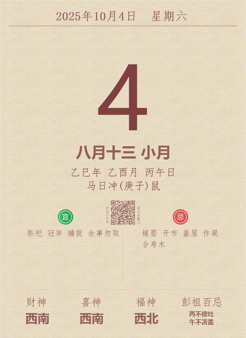 时宜:开市 入宅 修造 移徙 安床 作灶 祈福 求嗣 嫁娶 出行 安葬 赴任 求财 祭祀 交易