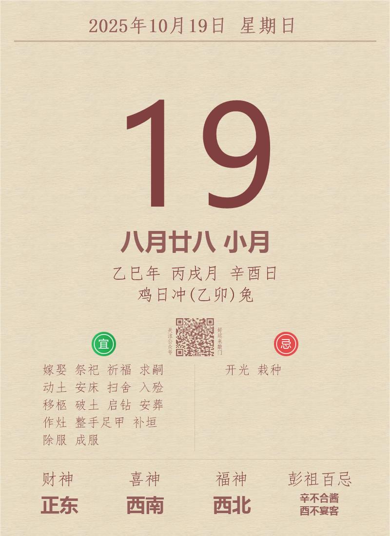 时宜:嫁娶 修造 入宅 开市 移徙 安葬 出行 求嗣 求财 交易 安床