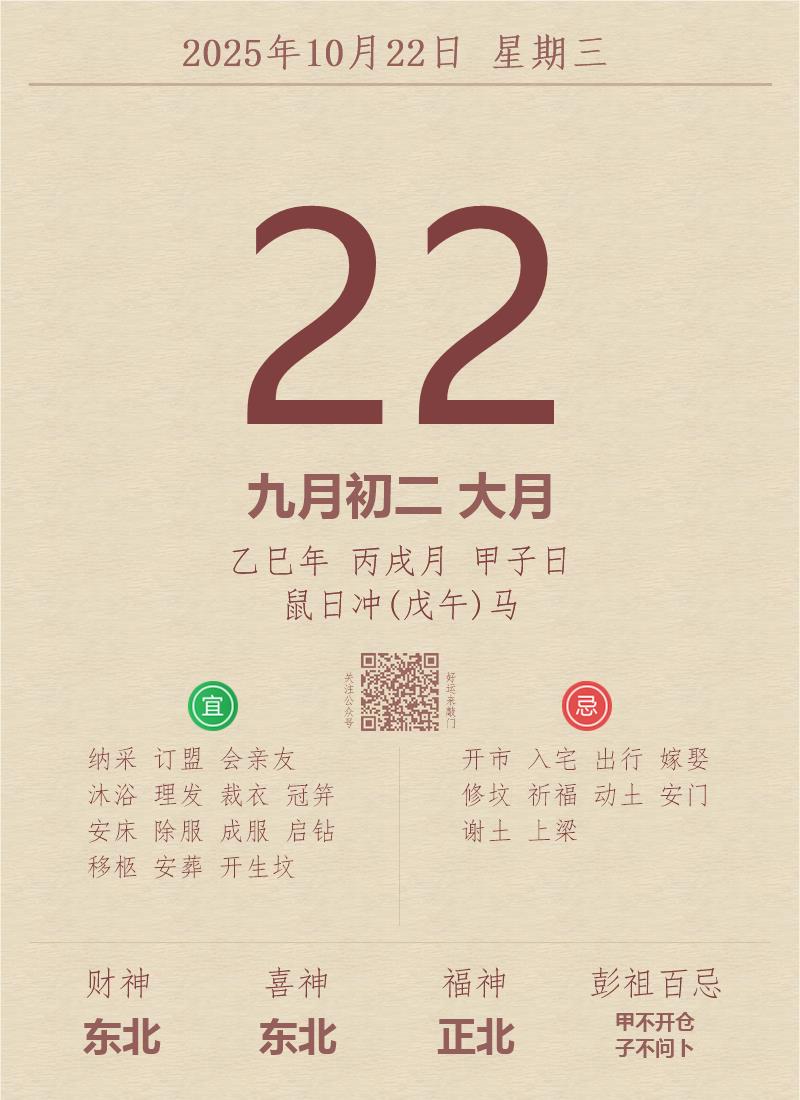 时宜:祈福 嫁娶 修造 入宅 安床 移徙 安葬 祭祀 求嗣 出行 求财 见贵 认养 开市
