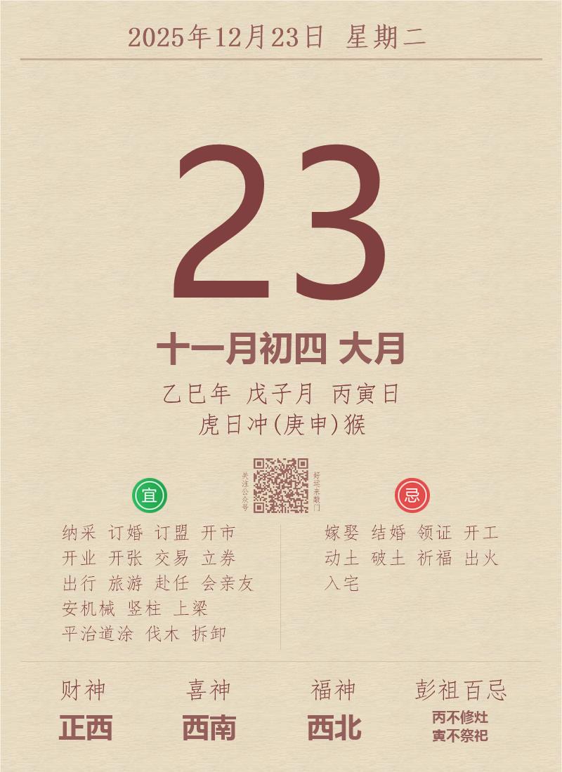 时宜:祈福 求嗣 订婚 嫁娶 求财 开市 交易 安床 祭祀