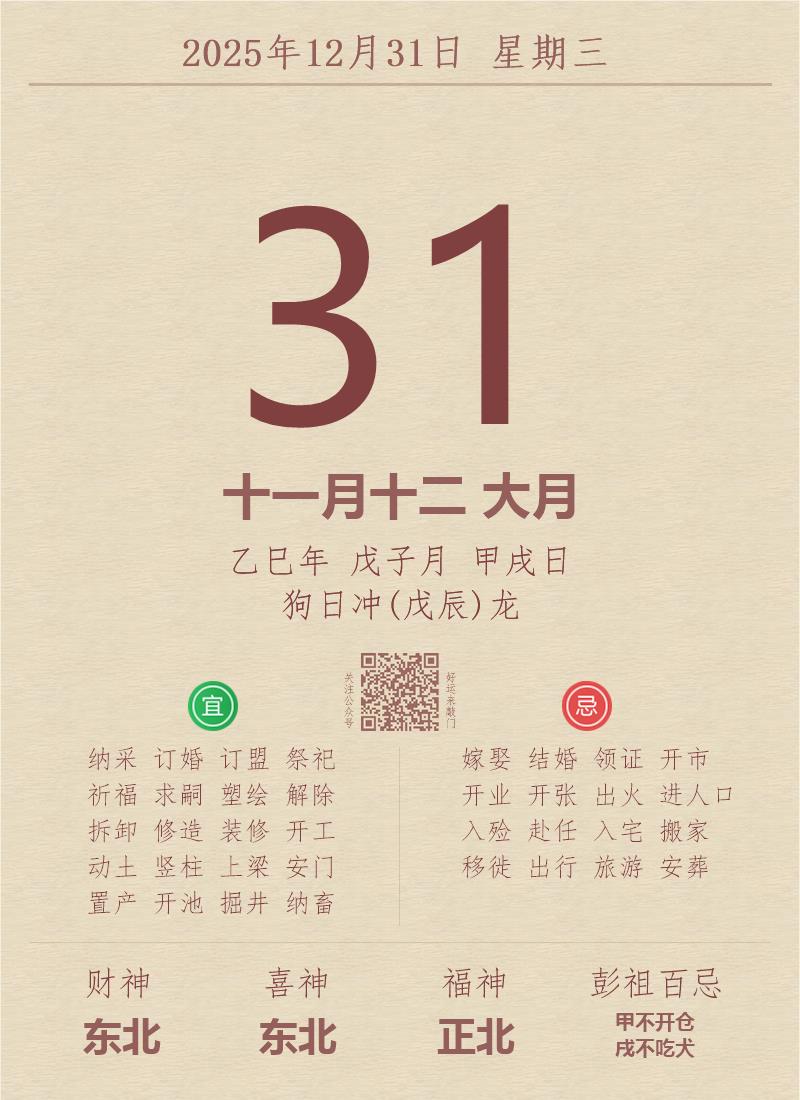 时宜:祈福 求嗣 订婚 嫁娶 求财 开市 交易 安床 入宅 安葬