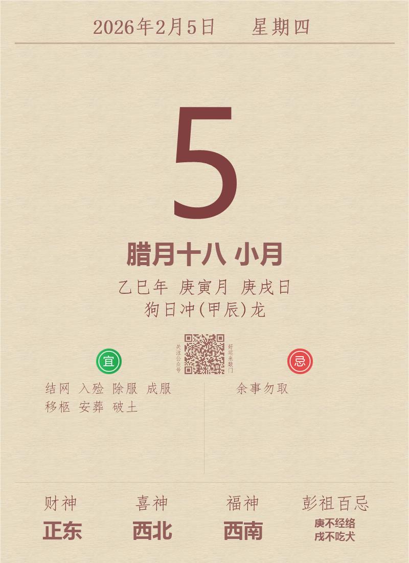 时宜:祈福 嫁娶 修造 入宅 移徙 安床 安葬 赴任 出行 见贵 求财 开市 求嗣 纳采