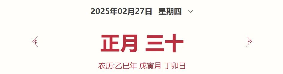 公元2025年2月27日,星期四,农历二零二五正月卅日。渐渐露出曙光,经过你不断的努力,开始有了收获,但还必须更加努力,才能有所成。运气良好,只要稳扎进行,并依照计划行动都能一一实现。