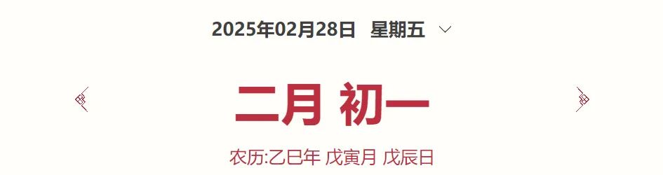 公元2025年2月28日,星期五,农历二零二五二月初一日。有崭露头角的机会,只要脚踏实地,你会获得好结果。好运来到,不要坐失良机,不要犹豫不决。
