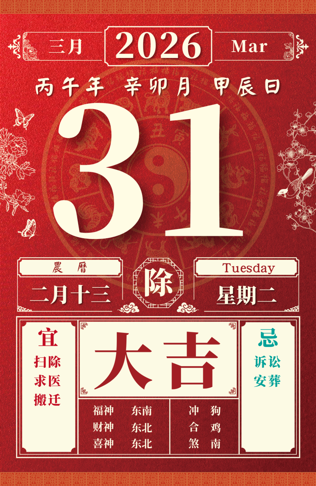除者,乃除旧生新之象。宜除服、疗病、断邪灵、出行、嫁娶。埋葬修葬遇吉宿好生旺亦吉。