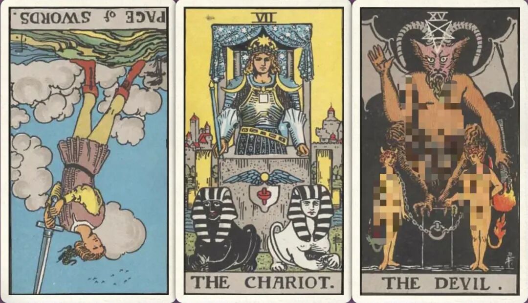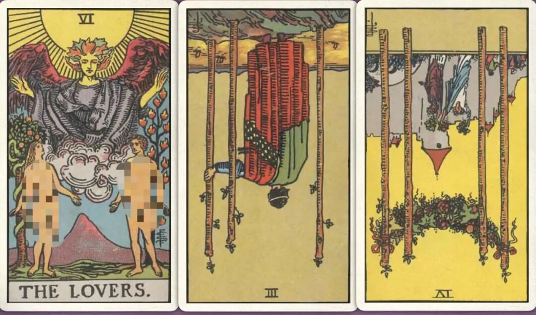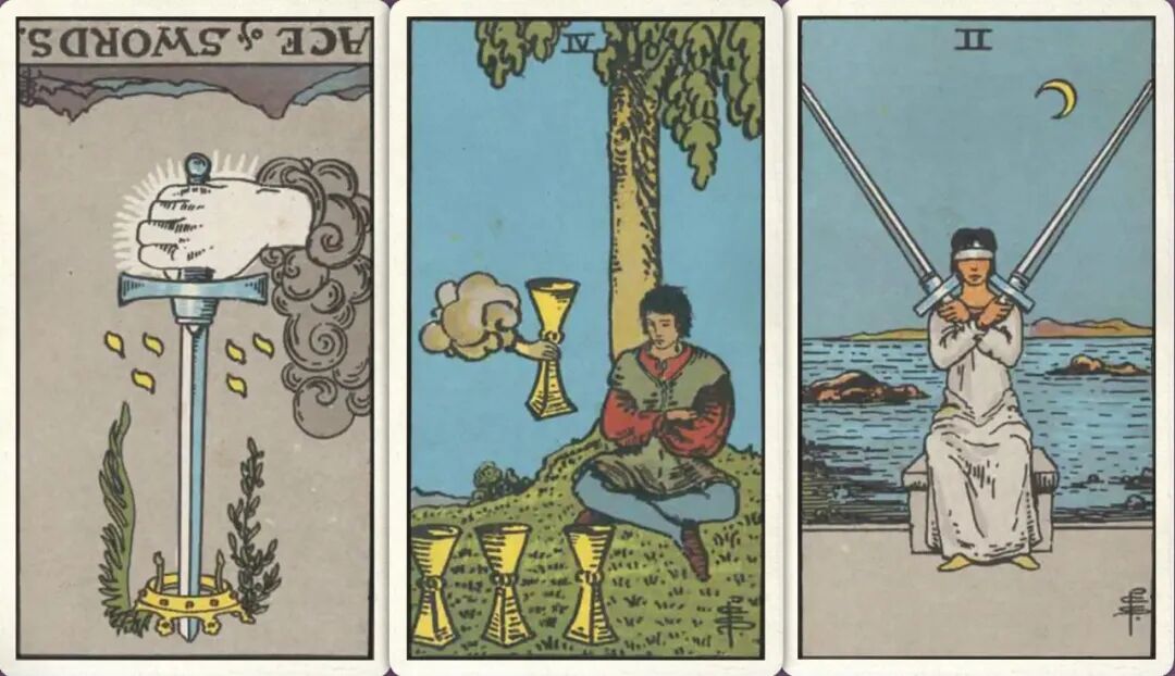 牌:宝剑ace- 圣杯四+ 宝剑二+