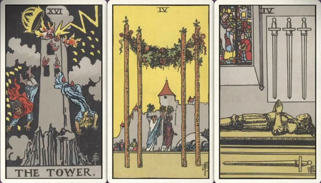 牌:高塔+ 权杖四+ 宝剑四+