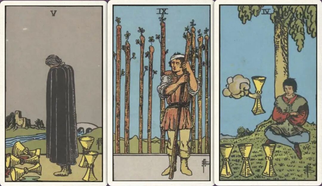 牌:圣杯五+ 权杖九+ 圣杯四+