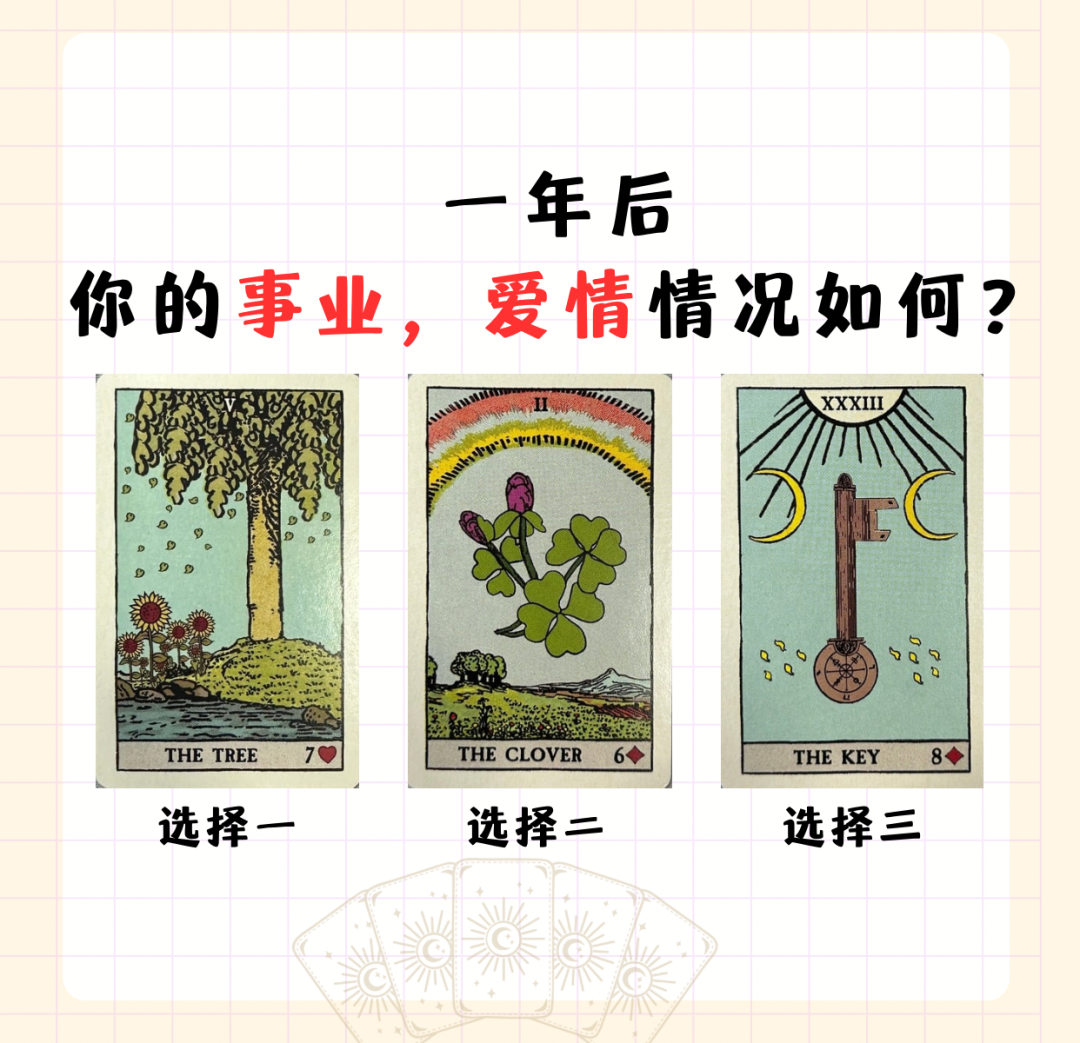 规则:保持内心安静的状态,在心里默念自己一年后,事业感情啥情况?从下面三张牌中凭感觉选出一张来,选好后,下翻查看答案。