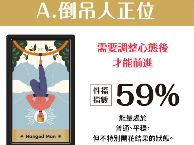 选择到倒吊人正位的人,2026 年的性爱运势属于「平稳但进展较慢」的类型。倒吊人象征等待、停滞与重新看待现况,代表你今年并非没有性爱机会,而是容易因为过度思考、需要安全感,或习惯先观察对方反应,而让关系停留在暧昧或不上不下的阶段。