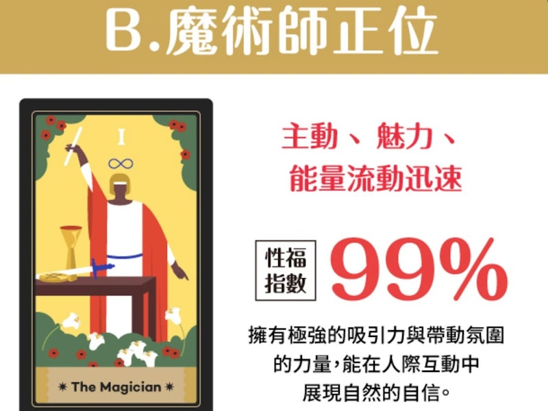 抽到魔术师正位的人,是 2026 年整体性爱能量最旺的一组。魔术师象征主动力、魅力、创造力与掌控节奏的能力,代表你今年在亲密关系中更敢表达、也更清楚自己想要什么。无论是沟通、互动还是情欲表现,都呈现高度流畅的状态。