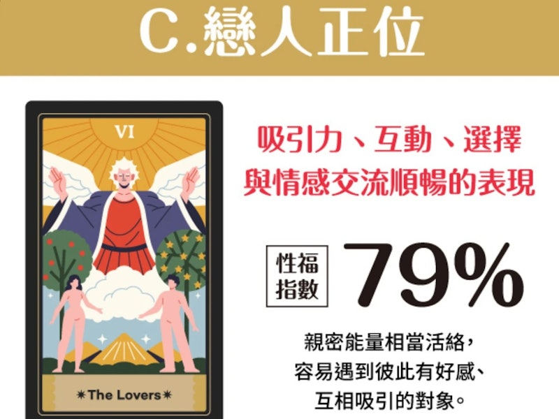 选择恋人正位的人,在 2026 年的桃花与性爱运势整体表现亮眼。恋人牌象征吸引、默契与双向互动,代表你今年容易遇到彼此有感觉、互相回应的对象,亲密关系自然升温,甜蜜中带着热度。不论是稳定交往中的伴侣,或刚开始接触的新对象,你们都能透过良好的沟通与情感交流,让性爱更投入、更有品质。