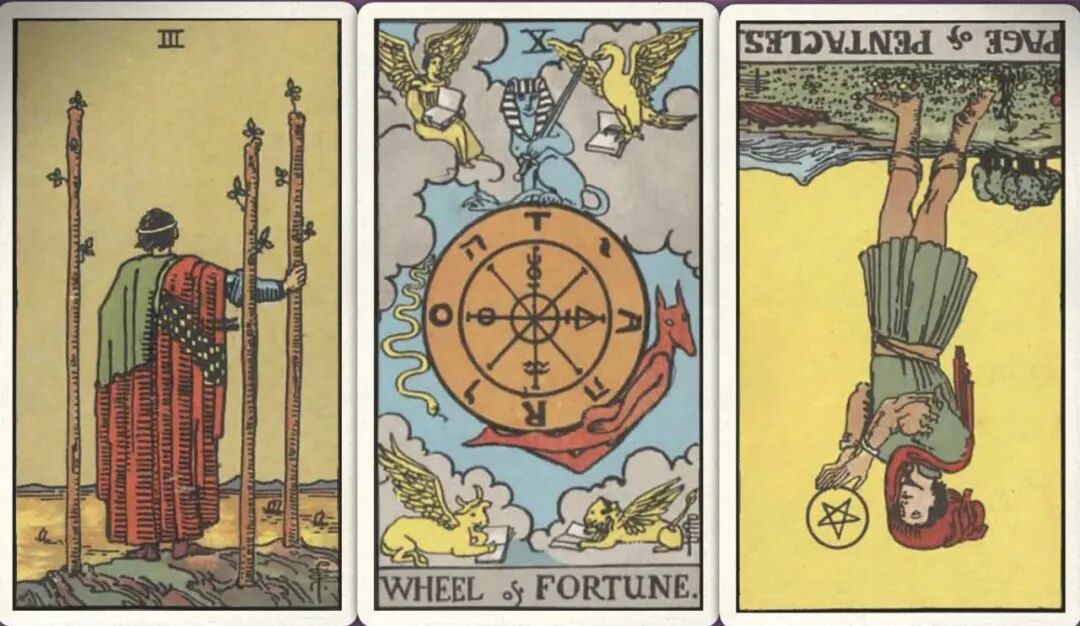 牌:权杖三+ 命运之轮+ 星币侍从-