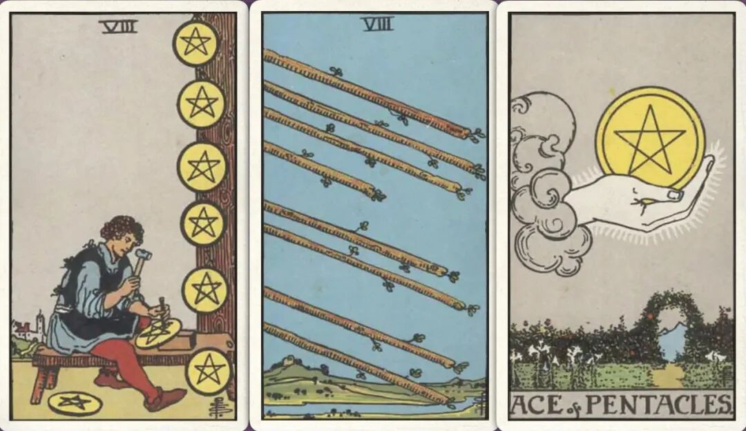 牌:圣杯八+ 星币七- 宝剑七-