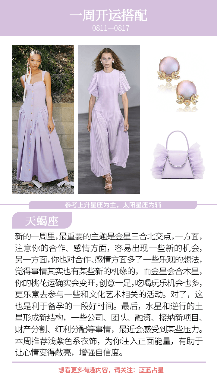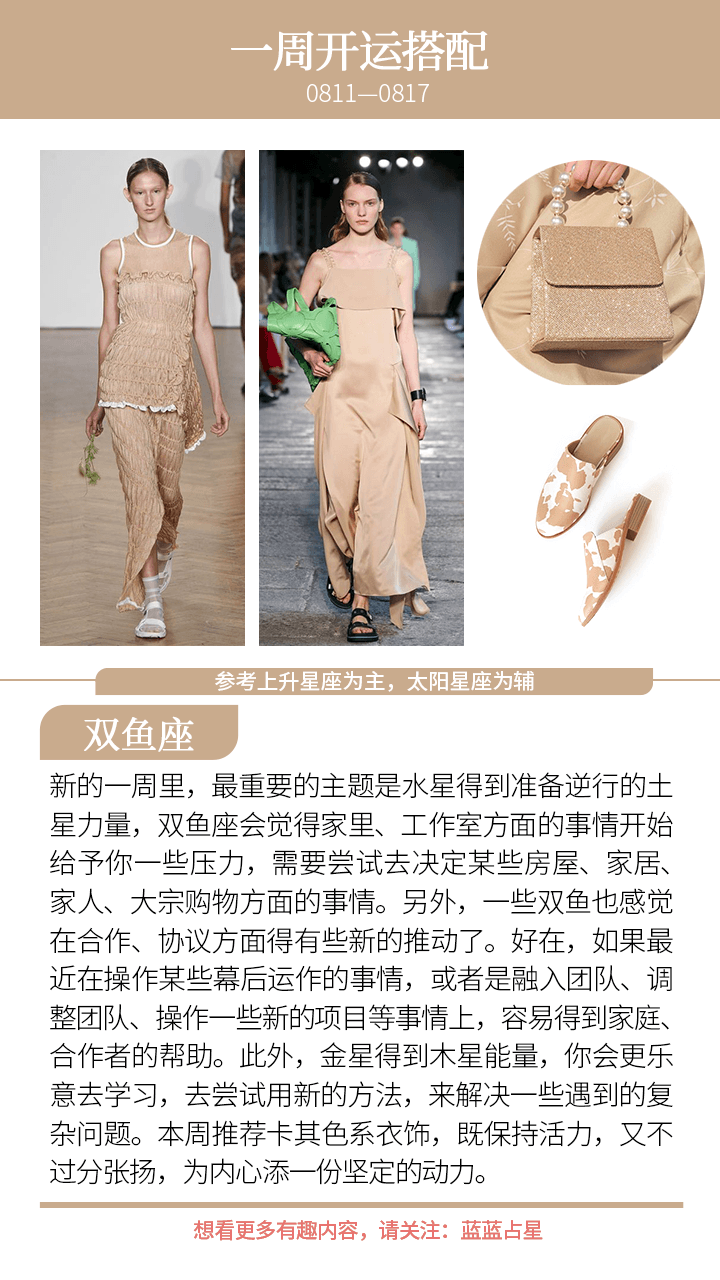 ——金星继续会合木星,金星三合北交点,金牛天秤狮子很多想法都冒了出来,有点迫不及待地想去做一定的改变,对未来的想法开始变得超前跳跃;射手和双鱼、巨蟹也放大了很多家庭、工作方面的事情,期待值变高,建议不要急,一步步去推进。