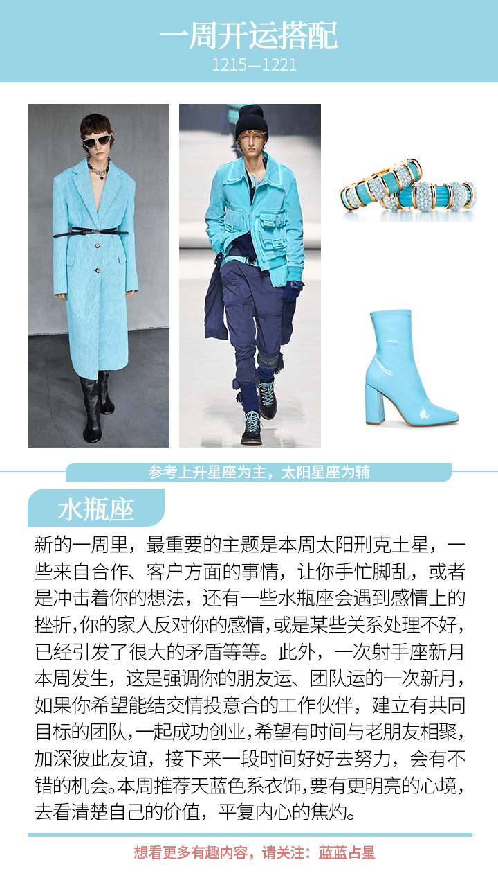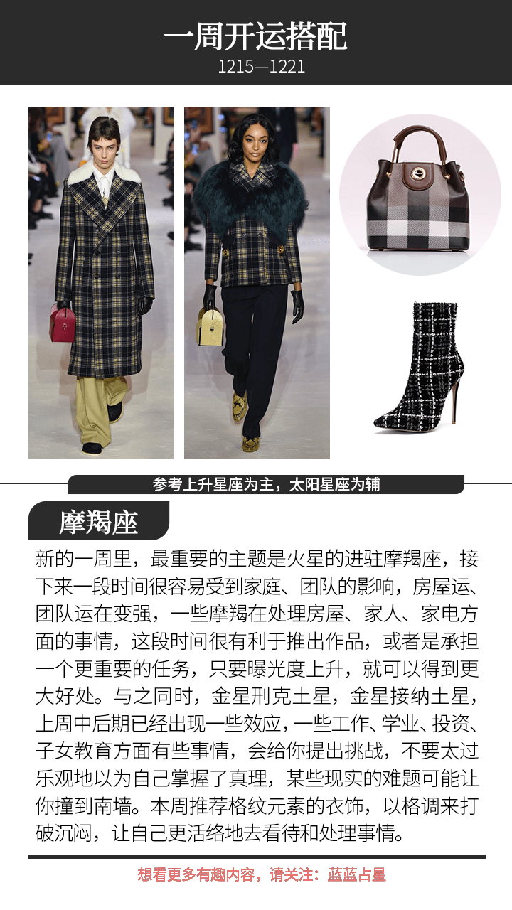 提醒(上升星座或太阳星座)金牛、天秤,本周身心容易不稳,要注意控制一下自己的情绪,以及注意健康。而(上升星座或太阳星座)摩羯和水瓶也要注意给自己更多安全感,不要被家事或者对外拓展的事情所牵引,踏实地过好自己的生活。