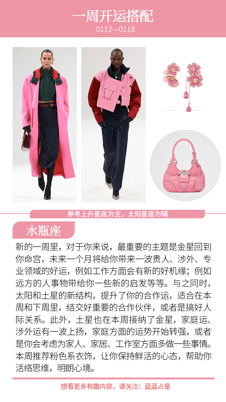 最后,金星本周要进入水瓶座,作为水瓶的贵星,金星一年一度地进入水瓶座后,将给水瓶带来一波很赞的力量,涉及到对外拓展、出国、旅行、贸易、互联网发展、考试得利、升职、获取更好待遇。要沾小贵人福气,未来一个月,请水瓶吃饭聊天看电影吧!